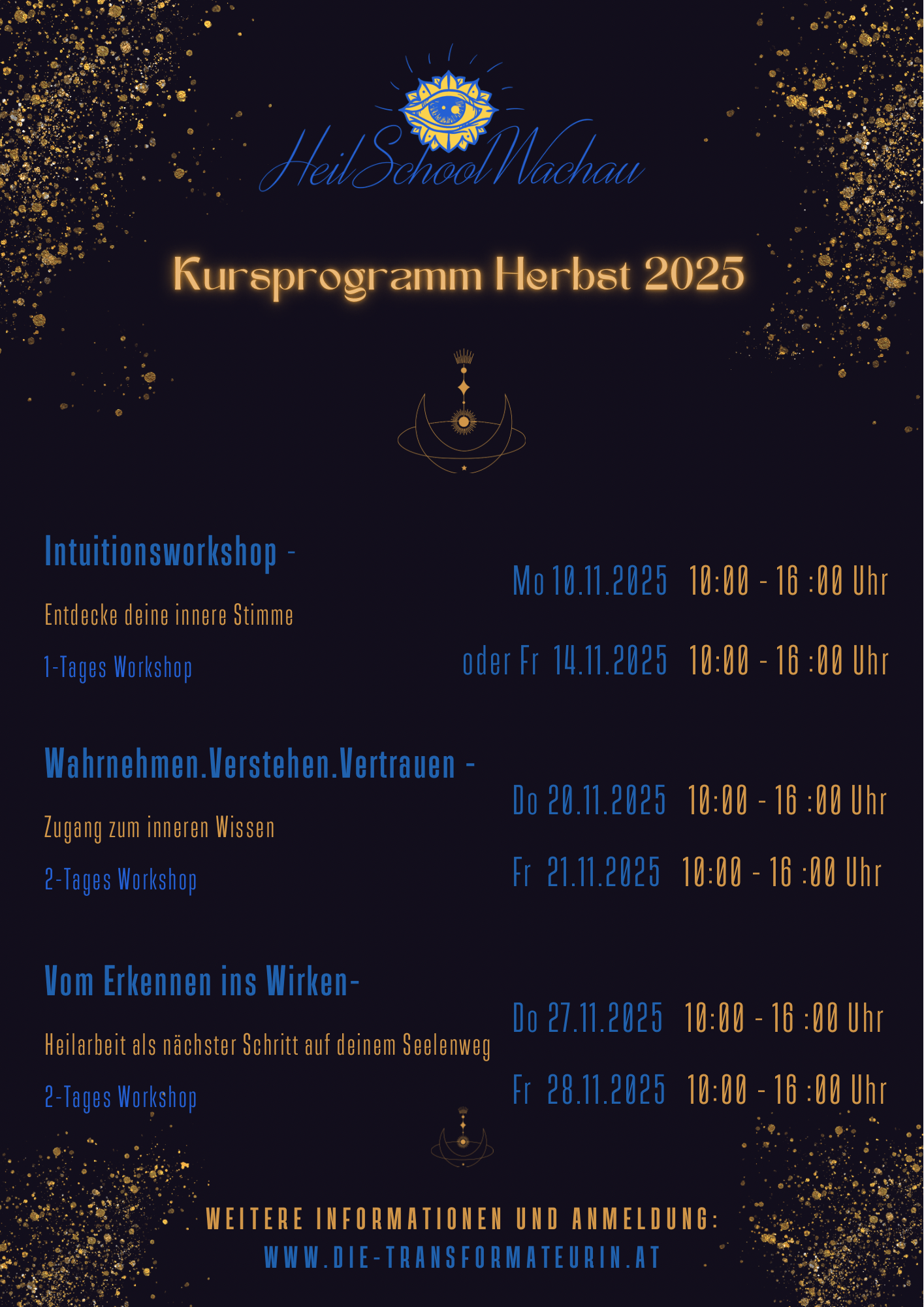 Alle Infos und auch die Termine für meine Workshops & Kurse zum Thema Bewusstseinsentwicklung, Wahrnehmung, Intuition & Selbstheilung findest du auf meiner HP: